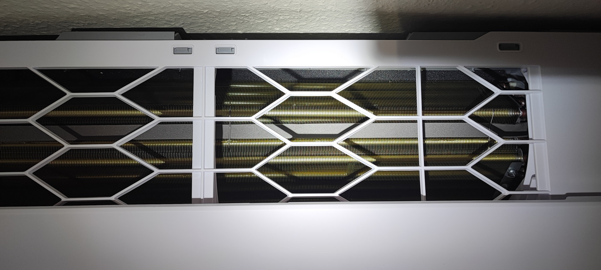 Die Schaumstoffstreifen verschließen die Lücken zwischen den Wärmetauscherplatten, damit die Raumluft nahezu komplett durch diese hindurchströmt. Solche Streifen gibt es auch bei anderen Herstellern, nur teils optisch weniger auffällig.