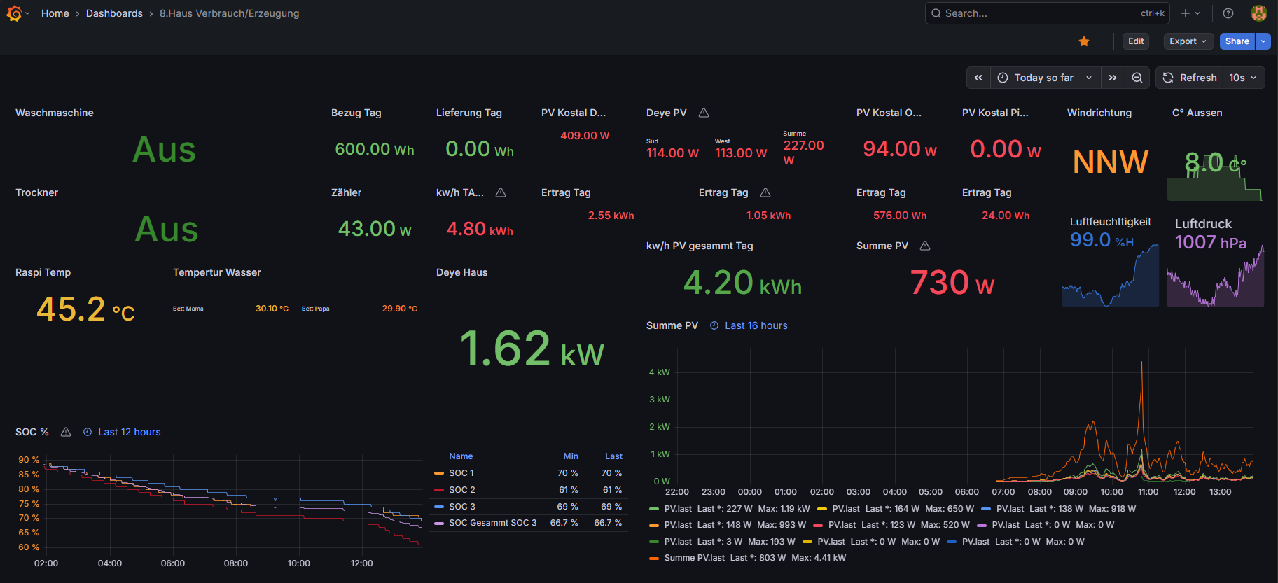 Hier mal ein Screenshot aktuell von meinem System der Zähler ist ein IR Lesekopf am Zähler die 43 W nimmt sich der Deye WR aktuell dauerhaft die 1,62 Kw sind mein aktueller Verbrauch mit Wärmepumpe vom kompletten Haus, du siehst heute kommt nicht viel von der PV, eigentlich zuwenig hier beziehe ich aktuell meinen ganzen Strom aus meinem großem Akku, erst wenn dieser Leer ist nimmt der WR sich wieder Strom aus dem Netz, aber nur soviel wie wirklich verbraucht wird, erst wenn die PV wieder genug Leistet wird der Akku auch wirklich wieder geladen