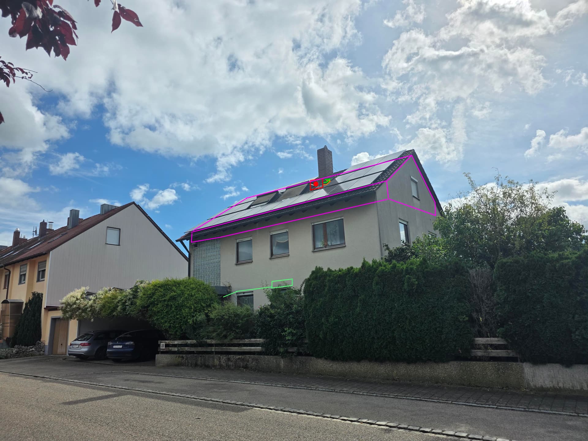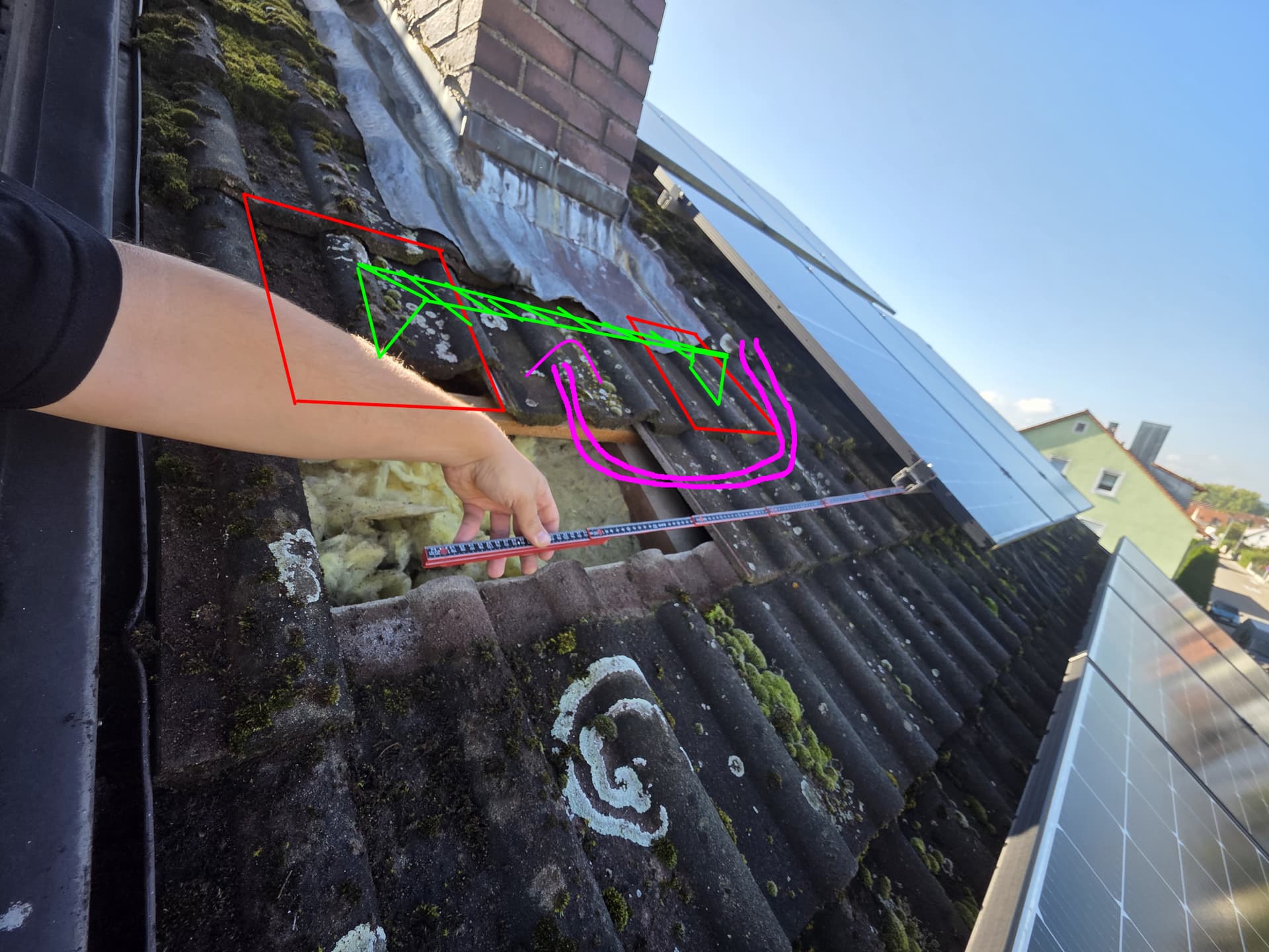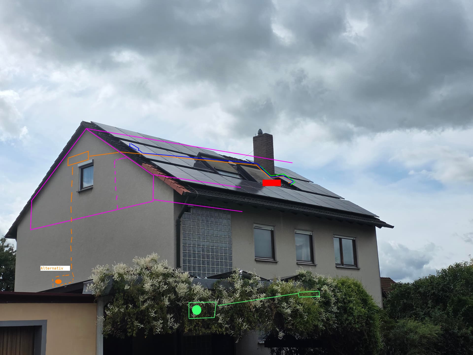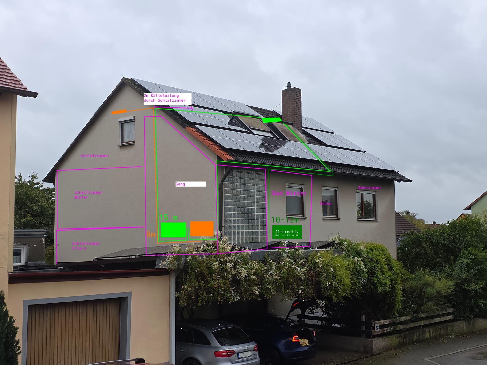 Ich hätte jetzt gerne ein Außengerät auf die freie Fläche unter dem Schornstein auf dem Dach gestellt und ein Innengerät im Wohnzimmer und im Idealfall ein weiteres im Schlafzimmer eingebaut da das durch die Türen schlecht erreichbar ist. Kühlung im Sommer wäre im Schlafzimmer nicht so wichtig, aber vor allem dann wegen der Heizung im Winter.