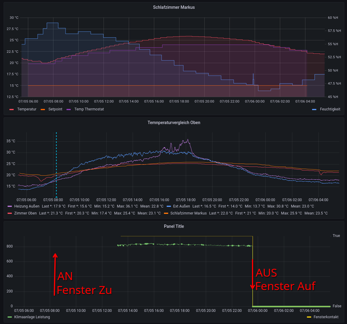 Mein Hauptproblem ist dass ich in das Dachgeschoss über die Nacht nicht genug Kälte rein bekomme. Ich habe in dem Sommer auf die Schnelle eine Monoblock Klimaanlage mit 9000BTU bei mir in der nicht ausgebauten Küche montiert und die hat es so einigermaßen geschafft die Temperatur zu halten (Bild anbei) wenn man Sie rechtzeitig angemacht hatte - alle Türen waren dabei offen. Genauer testen ging leider nicht da dann Plötzlich der Sommer weg war.