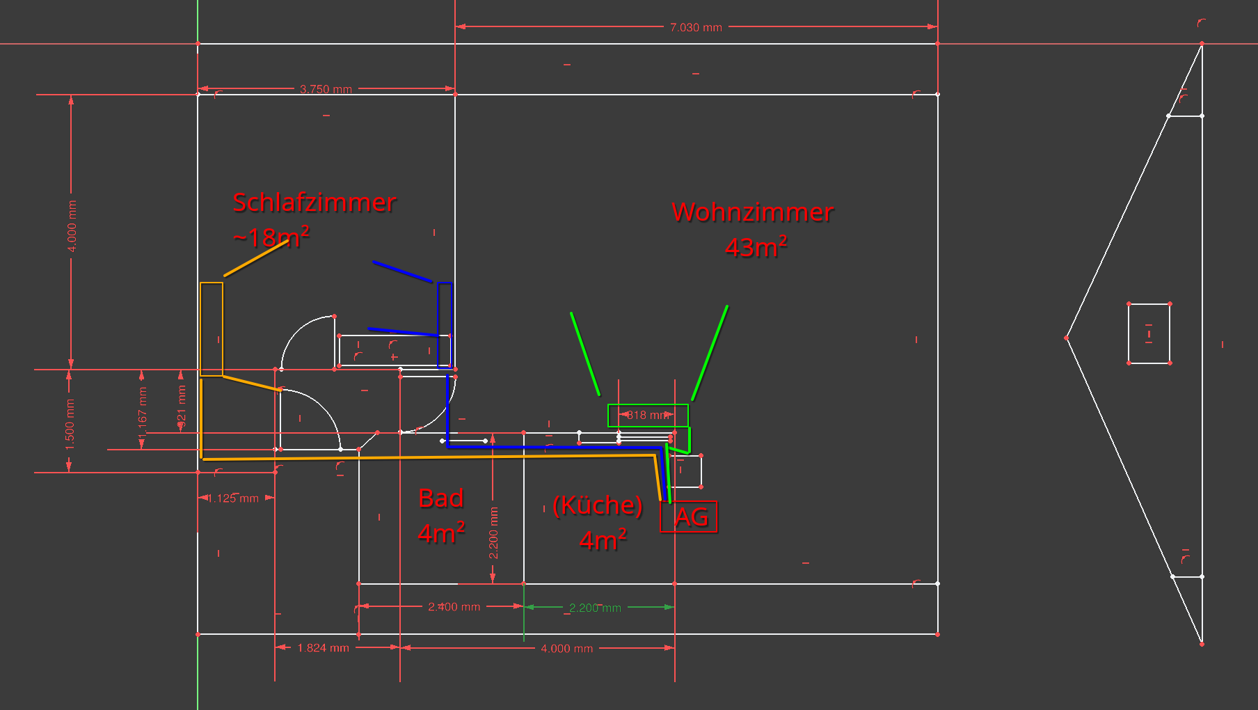 Falls ich im Schlafzimmer an die hintere Außenwand gehen würde +4m = 12,5