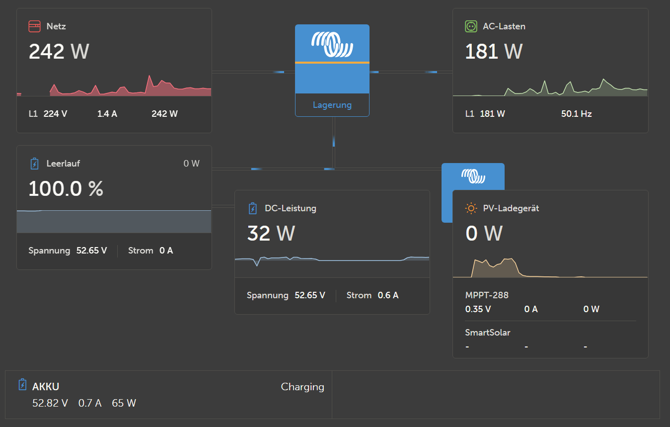 Also Trinastar sagt mir nix, aber du meinst sicher Trina Solar? Wie hoch ist denn die angegebene Leerlaufspannung (Voc) der Module? Ich meine bei 6 Stück in Reihe der 455er bist du doch ziemlich sicher schonmal über den 250V vom MPPT des Easy Solar. Wenn es 50V Voc sind dann sind sogar 5 Stück der Solarmodule in Reihe schon zuviel. Und du brauchst auch noch etwas Reserve für den Winter weil da die Spannung noch höher ist. Akku im Betrieb abgeschaltet ist ganz schlecht, das hat schon einige Victron Geräte in den Himmel geschickt.