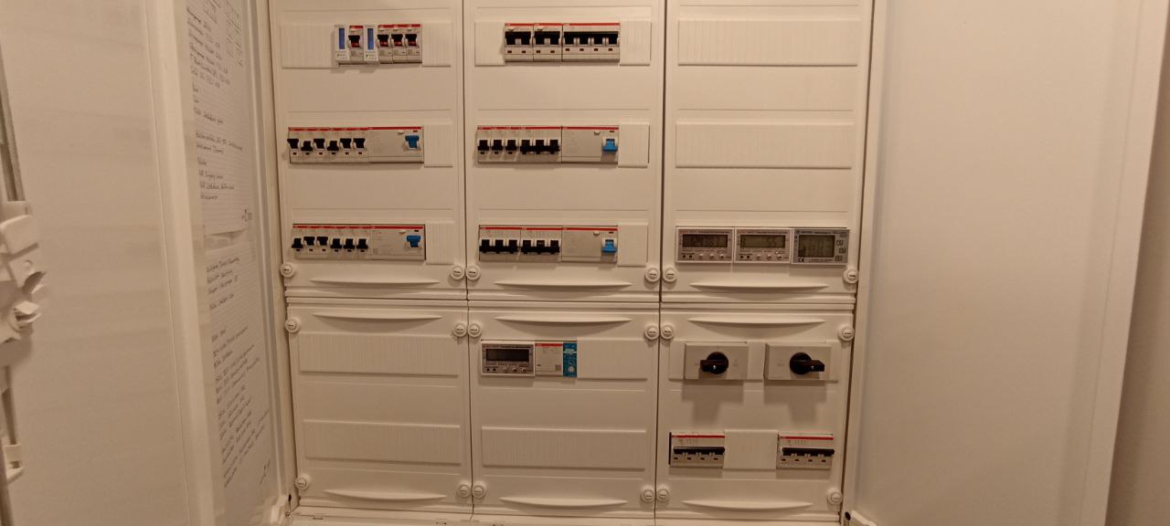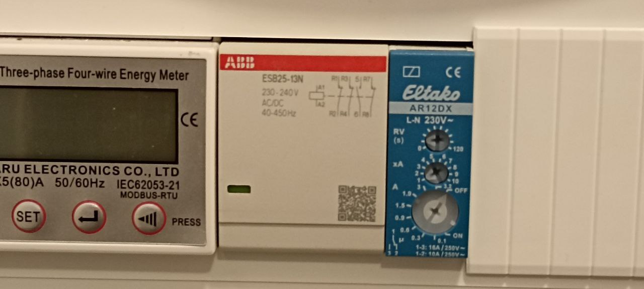 So ist es bei mir. Rechts das blaue ist ein Eltako. Das wäre in L1 vom Master-DLE zwischen geschaltet und man stellt den Auslösestrom ein. Wird dieser überschritten so schaltet dieses Relais, mit Nachlaufverzögerung → RV(s) Einstellregler. Links daneben der Schütz. 3 mal Öffner und 1x Schließer. An den Öffnern waren 2x einphasige kleine DLE für Handwaschbecken vorgesehen. Wenn also der Master-DLE Strom zieht dann werden die beiden DLE der Handwaschbecken ausgeschaltet. So verbraucht der Schütz nur dann Strom wenn der Master-DLE Strom verbraucht, sonst nicht. Hat sich bei mir aber erledigt.
