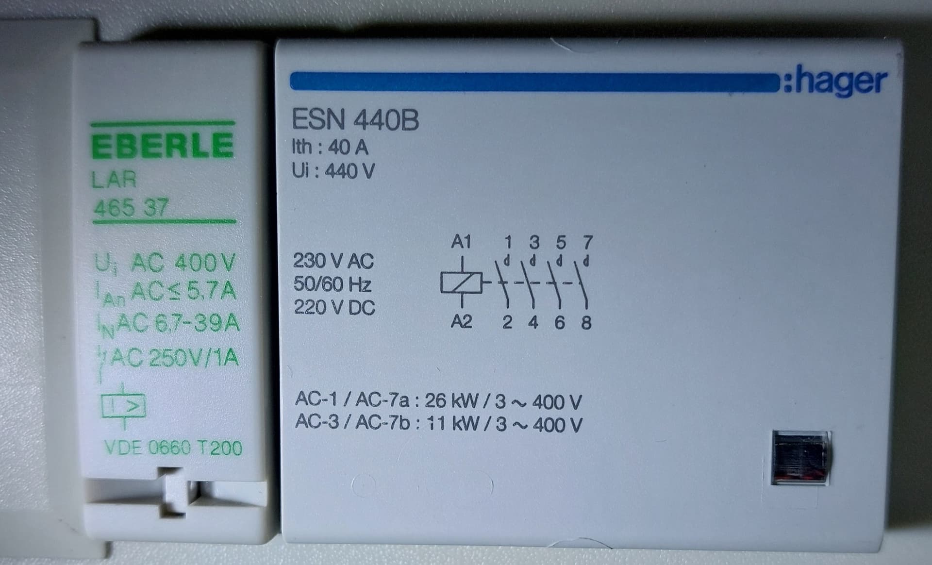 das Hager soll wohl 13.5W Verlustleistung haben und 4W Anzugsverluste. Ich habe aber nur das neuer Modell gefunden ESC440S mit 17.8W und 5W Anzugsverlauste. Also ca. 20W Verluste dauerhaft wenn ich das korrekt interpretiere. Plus die 4W vom Eberle. Also ca. 50Wh bei zweifacher Installation → 1.2kWh/tag = 438kWh/a. Schon heftig. Das ist der Grund warum ich meine Installation anders aufgebaut habe. Eltako 0.5Wh, schaltet im Nulldurchgang und ABB Schütz brauch 4W. Bei angenommenen 30 Minuten pro Tag DLE Betrieb sind das 14Wh/Tag = 5kWh/a, viel besser.
