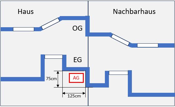 Zur baulichen Situation: es gibt keine relevanten Wände zwischen den Grundstücken. An der Vorderseite des Hauses gibt es eine zurückgesetzte Nische, die ich gerne nutzen würde. Einerseits liegt das kritische Fenster des Nachbarn hier um die Ecke, andererseits sollen solche Nischen den Schall eher verstärken. Ich hoffe, eher nach vorn (eher unkritisch) und weniger zur Seite. Ich füge mal eine Skizze bei.