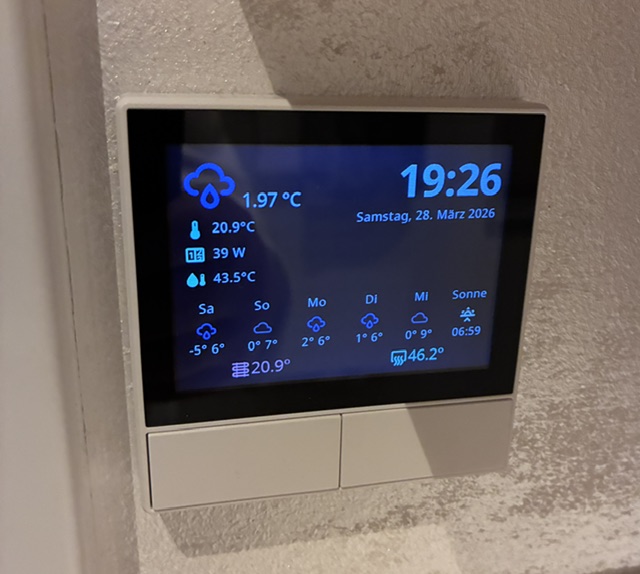 Ist ein Sonoff NSPanel (nicht pro) und passt in die standard UP Dose. Ist geflasht mit Tasmota und eingebunden in IoBroker. Es können nahezu alle Daten die im IoBroker vorliegen visualisiert, sowie auch geschaltet werden.