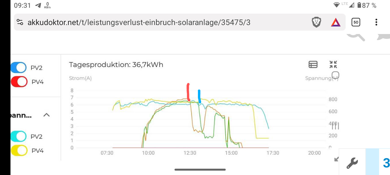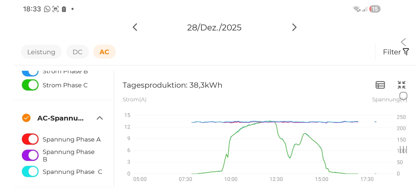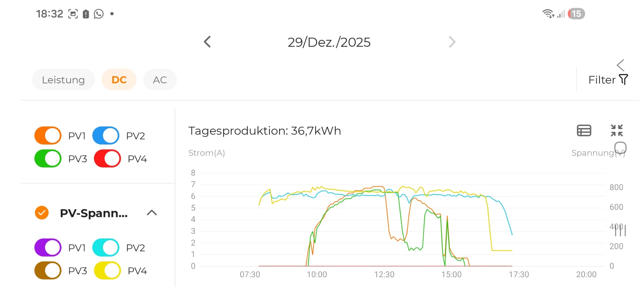 Im Anhang befinden sich nun 4 Bilder aus der App. Man sieht, dass der Einbruch identisch zum Vortag ist. Ich habe auch 2 Fotos von den Spannungen die der Umrichter zeigt. Einmal als DC und einmal AC. Ich kann diese Werte aber nicht 100%ig interpretieren. Ich finde es aber seltsam, dass die die Kurve die auch den DC Strom zeigt (orangene und grüne Kurve) nicht gleichzeitig einbrechen, sondern etwas versetzt. Letztes Bild im Anhang.