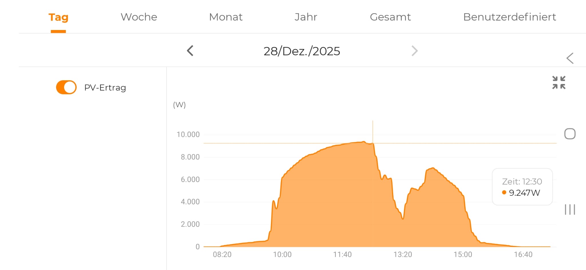Zur genauer Beschreibung: Die Leistung sackt ab 12:30 stückweise in 2 Schritten auf 2,5kW ab - kommend von 9kW und erholt sich dann erst gegen 14:10 wieder. Heißt die Kurve ist unsauber. Das gleiche Thema hatten wir auch an den anderen Tagen, an dem die Sonne durchgehend schien. Die Kurve sieht dann auch immer identisch aus vom Leistungsverlust. Erst fährt sie sauber hoch bis 12:30, dann immer das gleiche Bild.