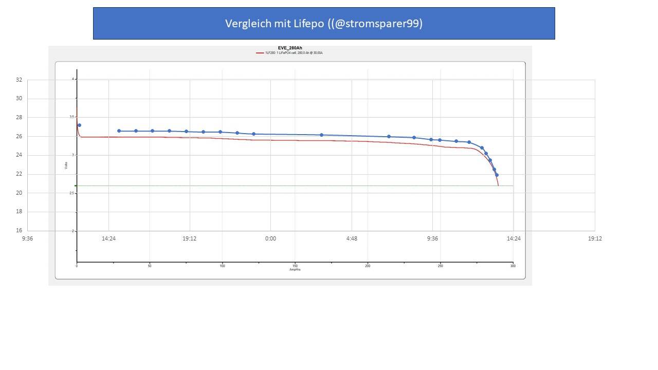 Mein Fazit ist, das die Kennlinien echt ganz gut zu den gefundenen Lifepo Kennlinien passen. Sie ist im Vergleich mit der einen LiIon Kennlinie eben viel länger, viel flacher - passt gar nicht gut.