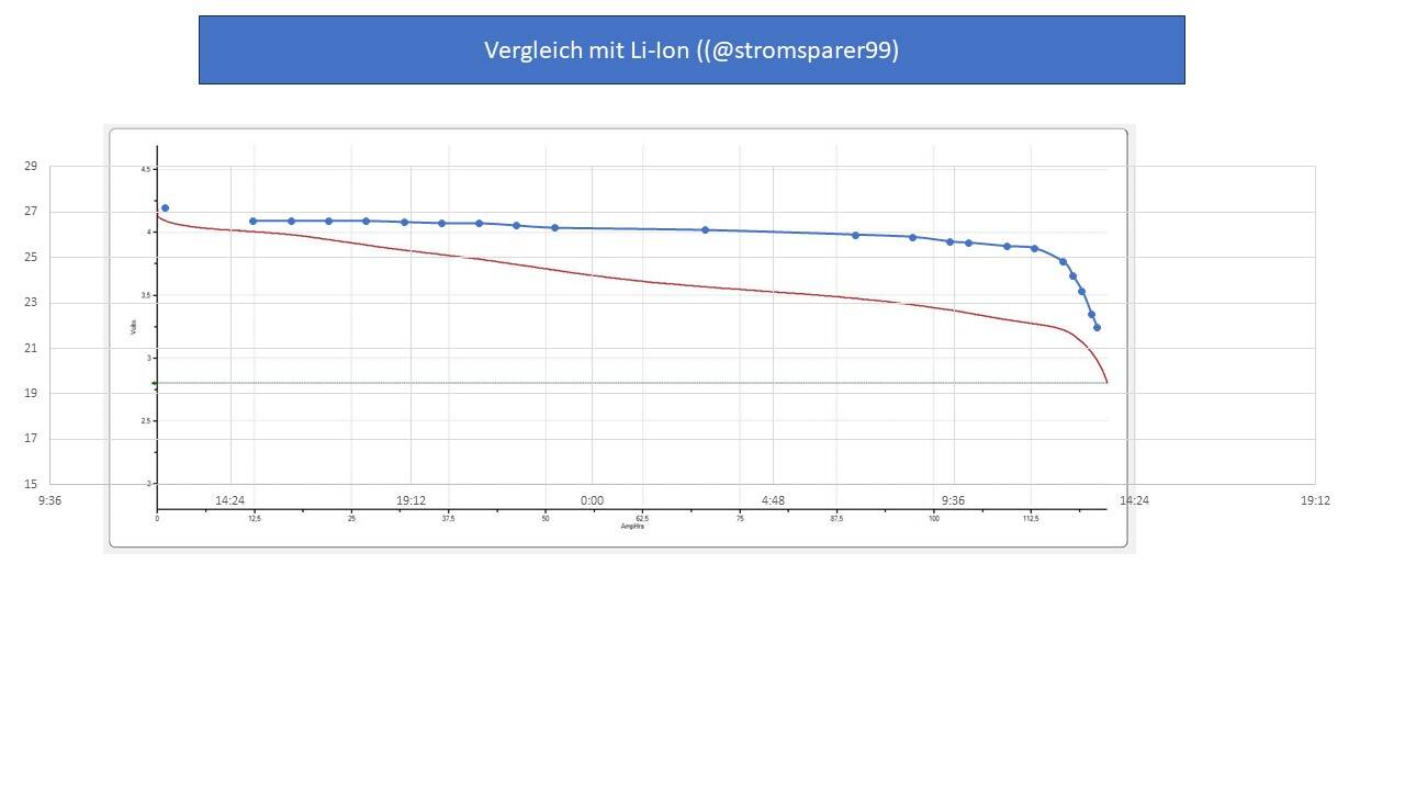 Ich habe mittlerweile auch gelernt, dass LiIon eben auch ein Oberbegriff ist, und sich darunter verschiedenste Ausprägungen sammeln können, die wieder andere Kennlinien haben (siehe auch Li-Ionen Batterien (Berechnungsgrundlagen) :: PV*SOL® Hilfe (valentin-software.com)). Aber die Gängigsten scheinen wohl die LiMn zu sein, und die fallen eben schneller ab.