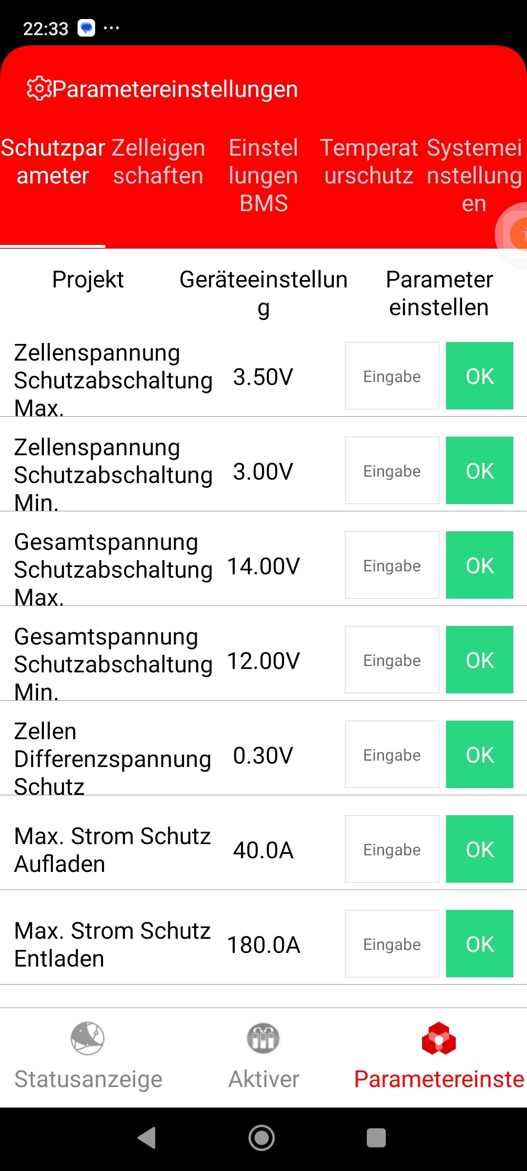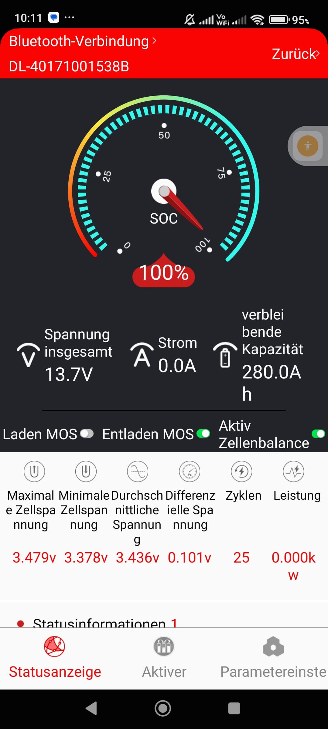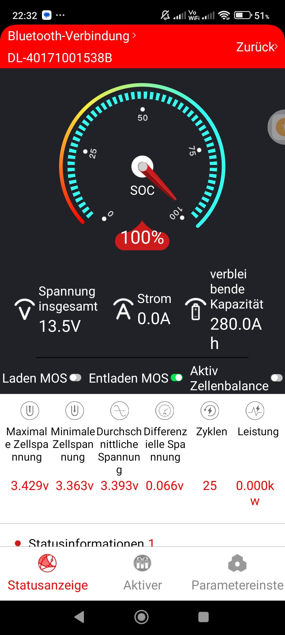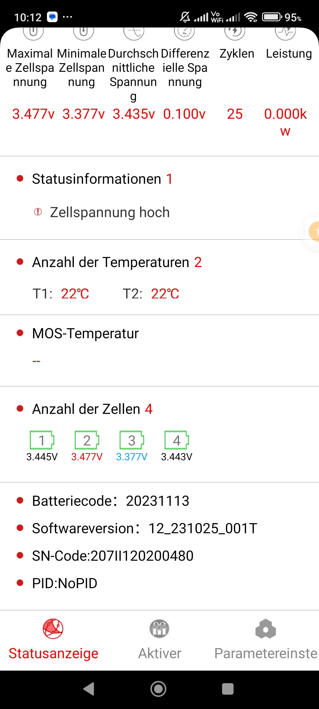 Die Zelle mit der höchsten Ladung zeigt 3,429 V an. Die Zellspannung Schutzabschaltung ist auf 3,50 V eingestellt Was meinst du mit die Zelle ist randvoll? Sollte das BMS nicht bei 3,50 V abschalten?