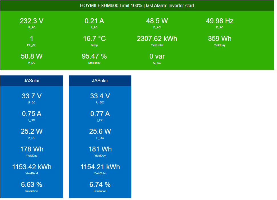Momentan hab ich eins mit 2 Modulen 600 wp. Tagsüber bei gutem Wetter habe ich meist in bisschen Überschuss, das heißt die Grundlast ist bei mir meist gedenkt bei guter Sonneneinstrahlung.