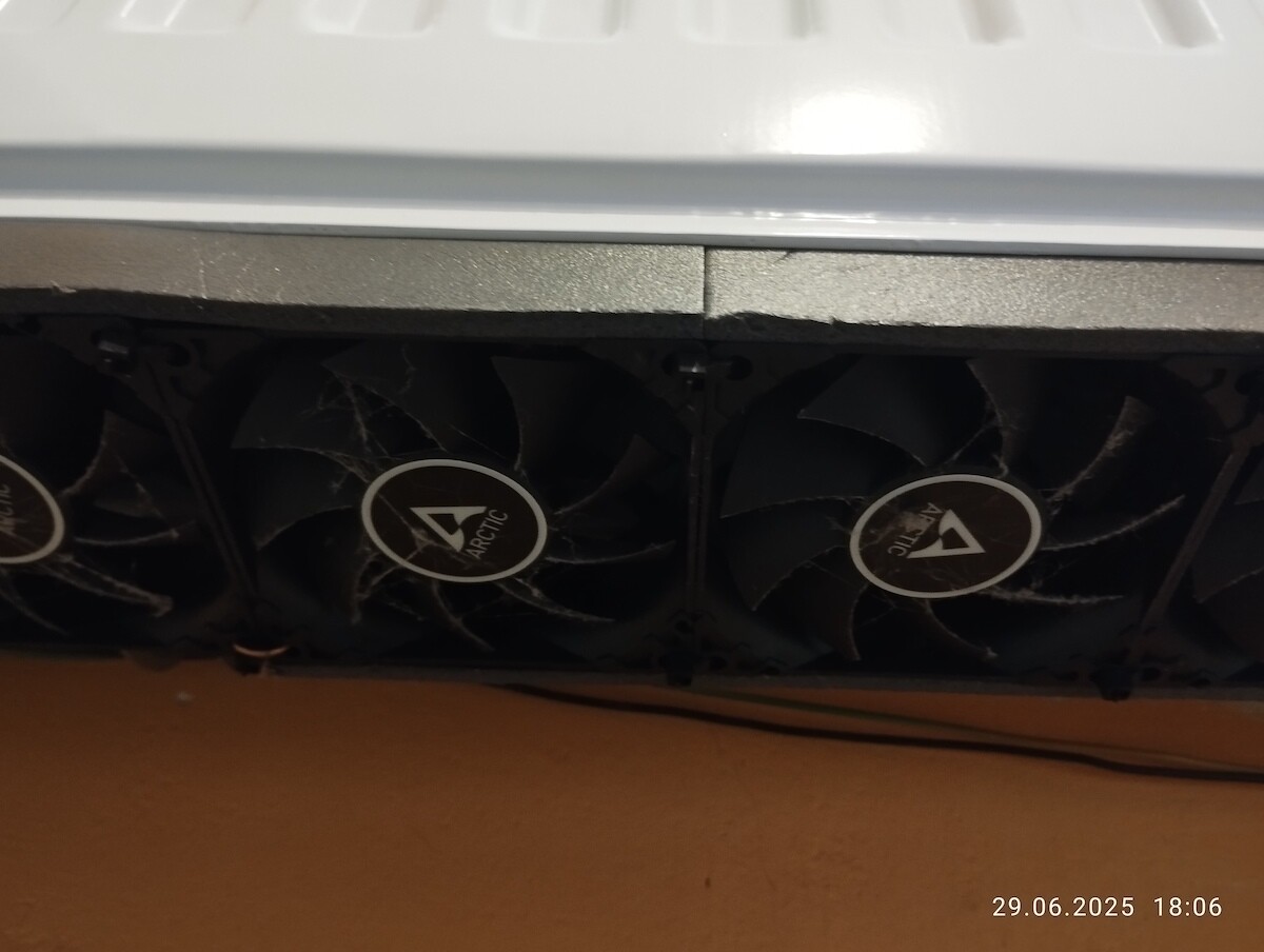 Das ganze kann ich nun satt von unten unter den 22er HK stecken. Die Dämmstreifen dichten den Lüfterblock luftdicht seitlich zum HK und verhindern gleichzeitig, das die Lüfter den HK berühren.