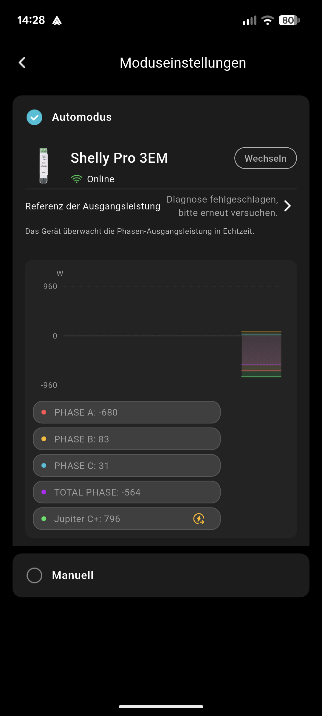 Seit letzter Woche wurde der Shelly 3em Pro installiert. Den habe die mit dem Jupiter C+ verbunden.