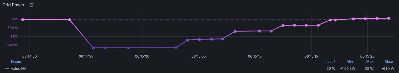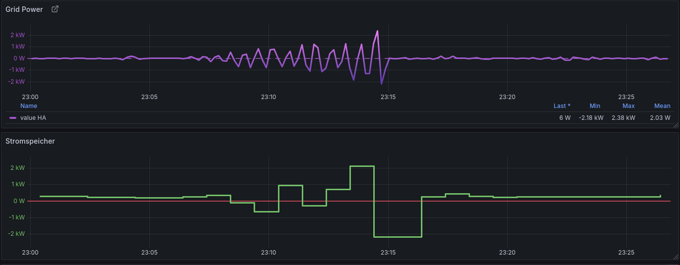 Damit habe ich bei einer 1,6kW Last eine Reaktionszeit von 25 bis 30 Sekunden, bis alles wieder im Bereich um die 0 angekommen ist. Aber es geht immer Schrittweise und es gibt gar keine Schwingung mehr.