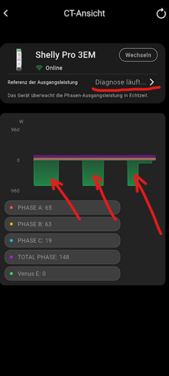 In der Marstek App gibt es im CT-Geräte Screen eine Auswahl "Dreiphasen-Summe (Phasen A+B+C)" oder "Einphase" und "Autodiagnose". Beide Auswahlmöglichkeiten und die "Autodiagnose" haben bei mir nix bewirkt. Was habt ihr ausgewählt?