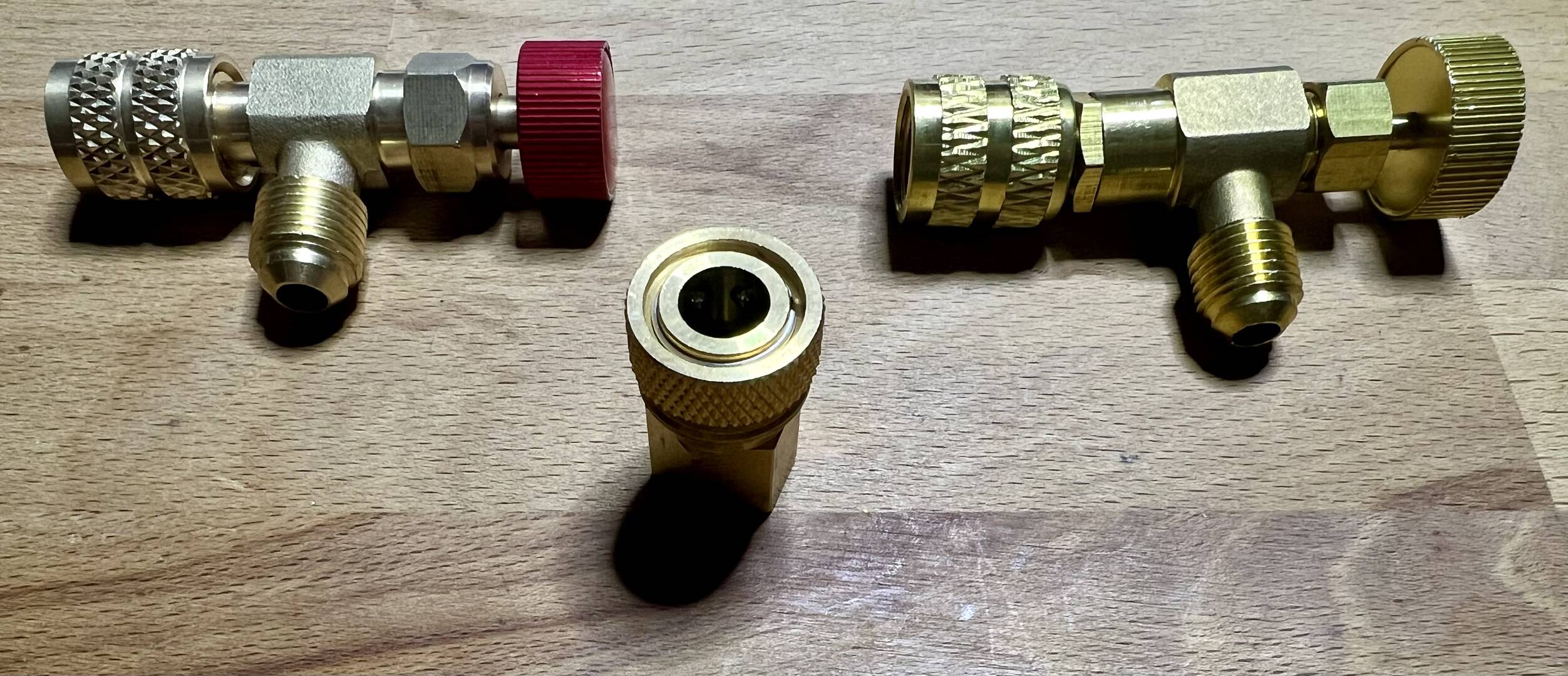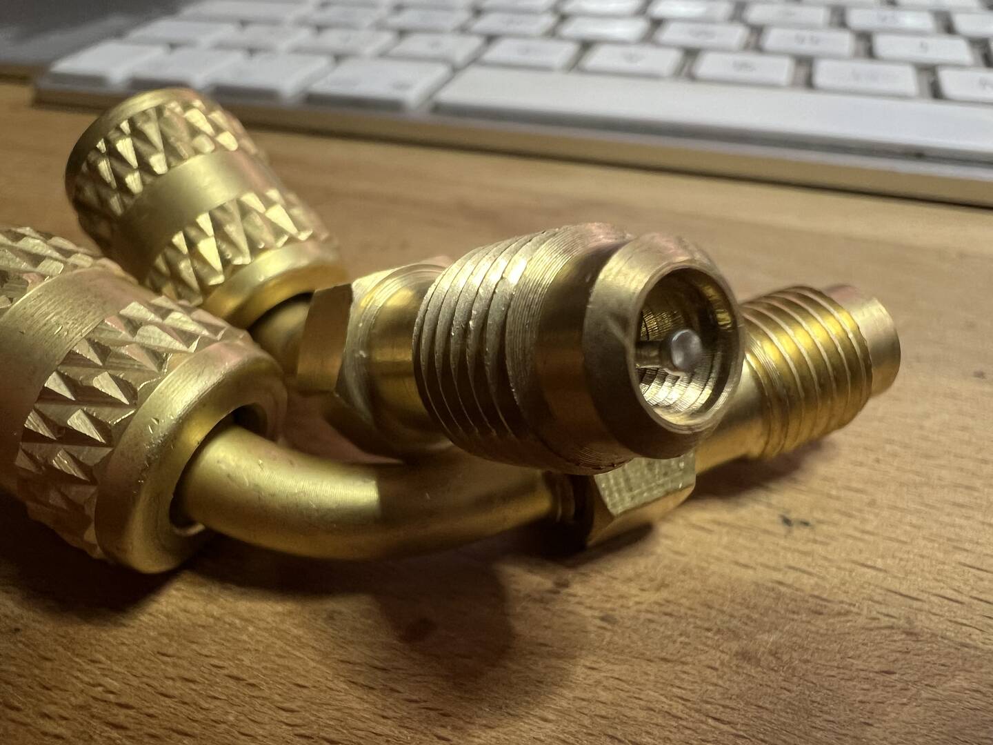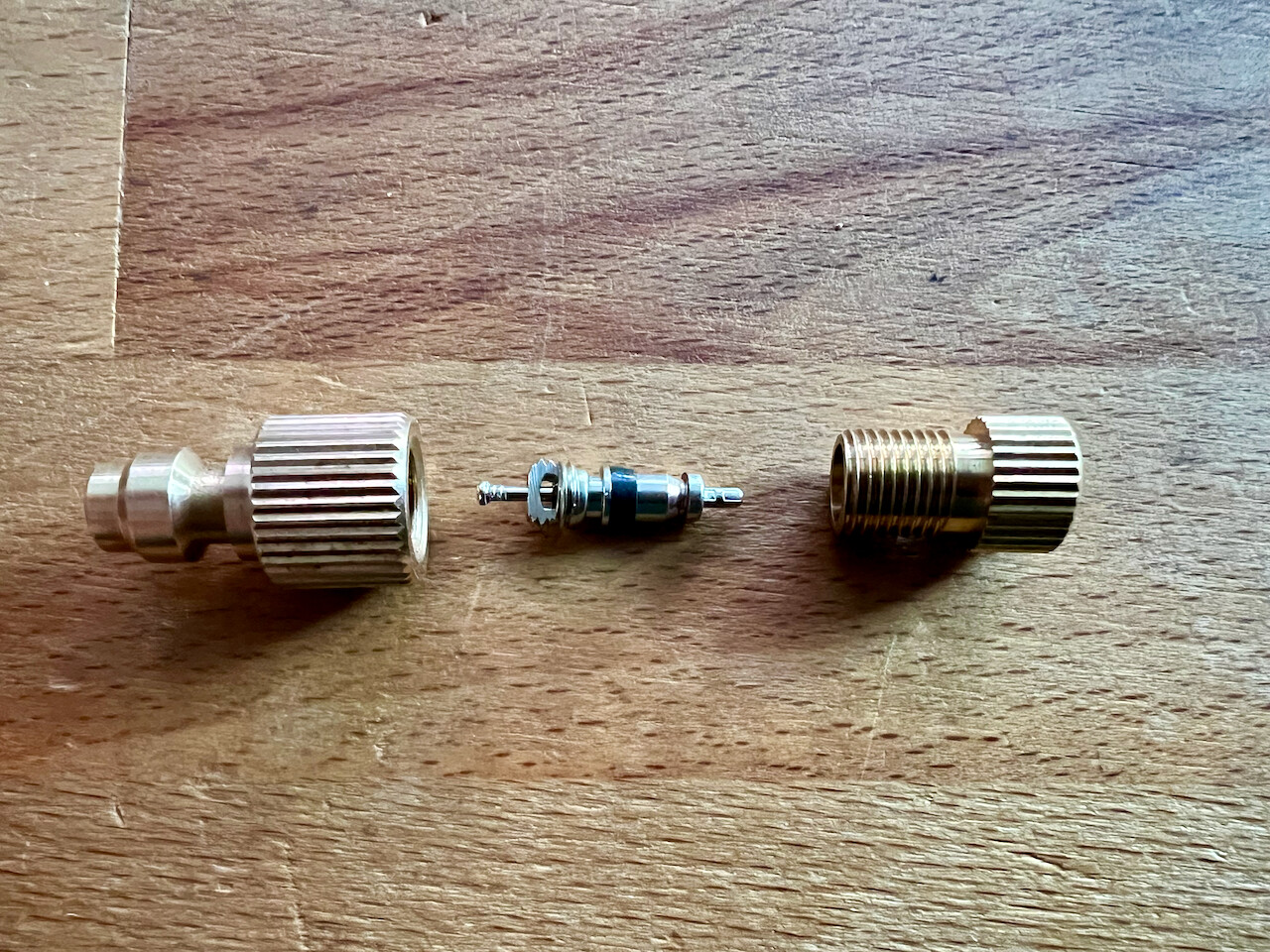 So, bin nun einen riesigen Schritt weiter gekommen: habe ein Schrader Ventil gekauft und mit dem Adapter in meinem Fundus passte der gut an die Luftpumpe (links). Nun muss ich das Ganze nur noch irgendwie in einer Überwurfmutter (1/4 oder 3/8) unterbringen.