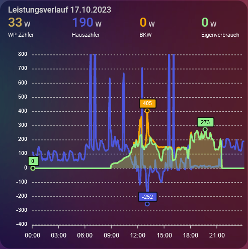 Die Abgaberegellung ist kurz nach 18 Uhr eingesprungen, ab dann sieht man quasi keine Netzeinspeisung mehr (blaue Linie bleibt über 0 W) und der Eigenverbrauch (grün) deckt sich komplett mit der Einspeisung vom BKW (orange). Den angezeigten Netzzähler der Wärmepumpe habe ich der Übersichtshalber ausgeblendet.