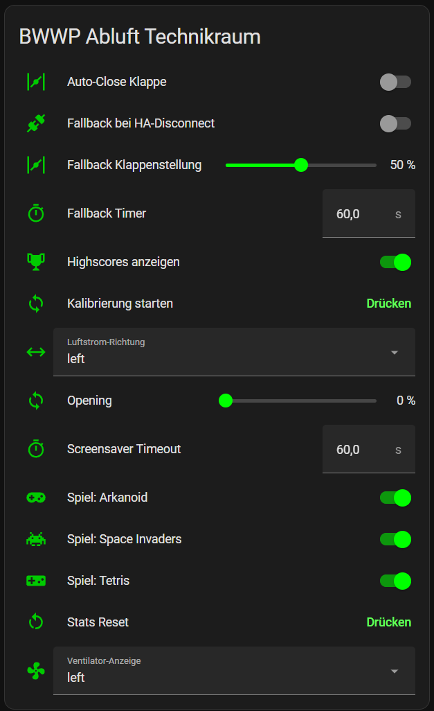 Auf dem Display ist die Klappe mit Luftfluss, Klappenstellung und Rotoren animiert. Als Bildschirmschoner (Ja Bildschirmschoner