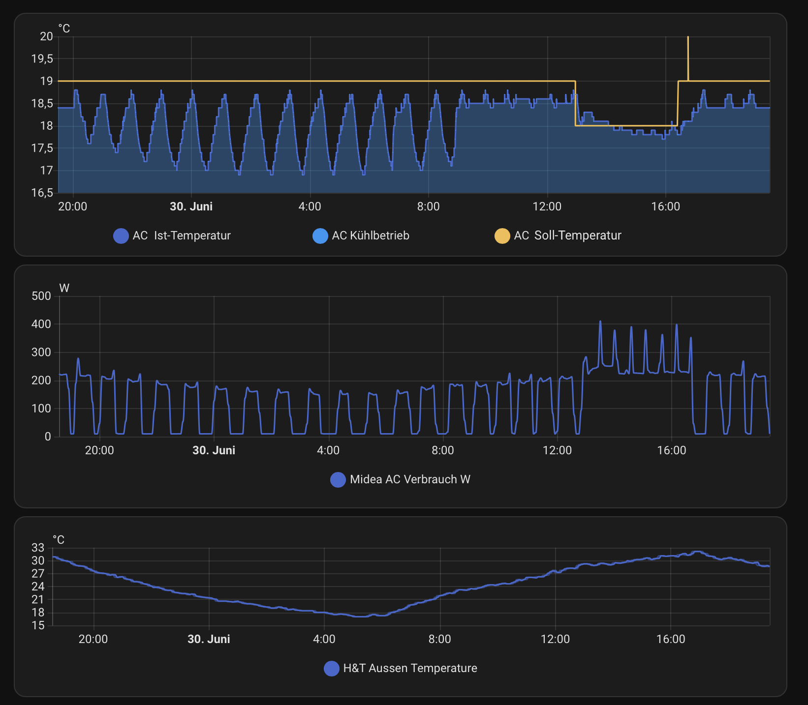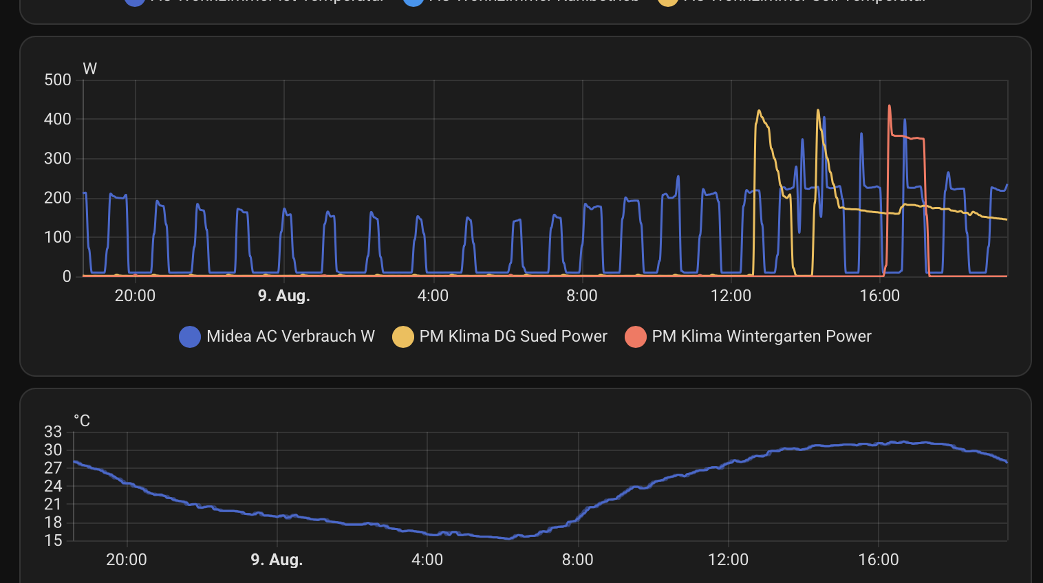 Was mich echt wundert, ist warum die Midea so stark "taktet". In dem Bild ist es die blaue, gelb ist Daikin. Ich denke man sieht bei der Midea, dass sie die Leistung ja schon sehr fein regeln kann, aber dann taktet sie doch immer wieder?