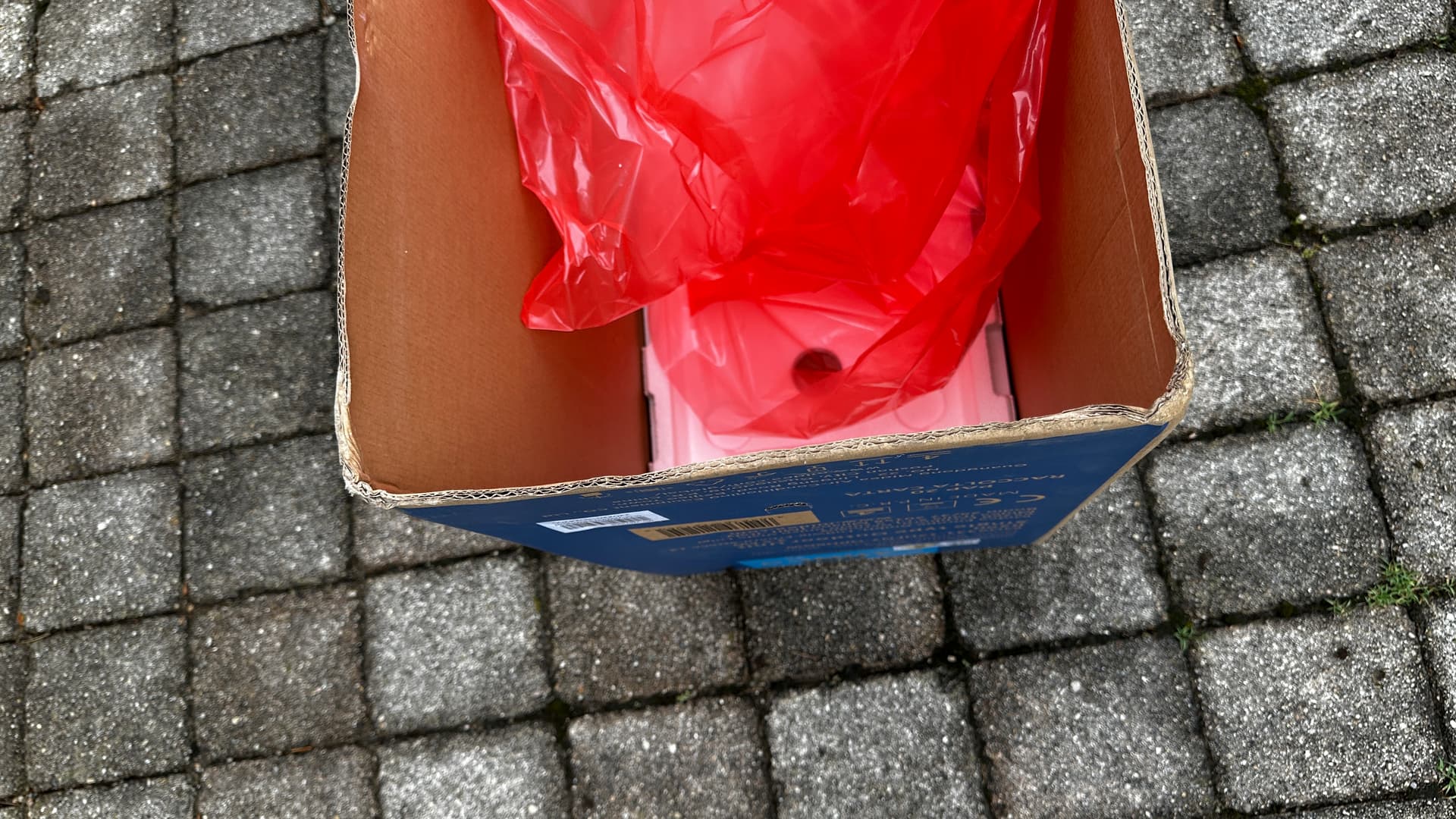 Der Styroporblock unten ist gebrochen und der Karton wurde an den Ecken umgebogen und schaut sehr benutzt aus. Das ist doch kein Neugerät.