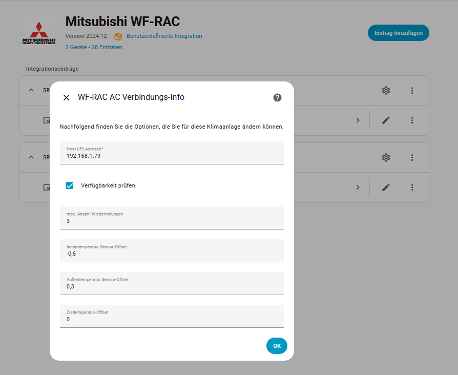 Daher habe ich die Mitsubishi-WF-RAC-Integration für Homeassistant etwas angepasst. Für alle Temperaturen lässt sich nun ein “offset” definieren.