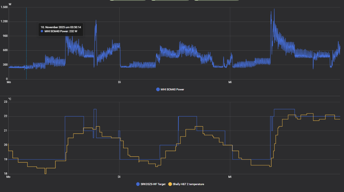 Ich muss erst warten, bis der Fehler nicht mehr auftritt, daher laufen parallel noch die Heizkörper mit, damit keiner friert, wenn ich nicht da bin, dadurch taktet die Klima aktuell wie wild.