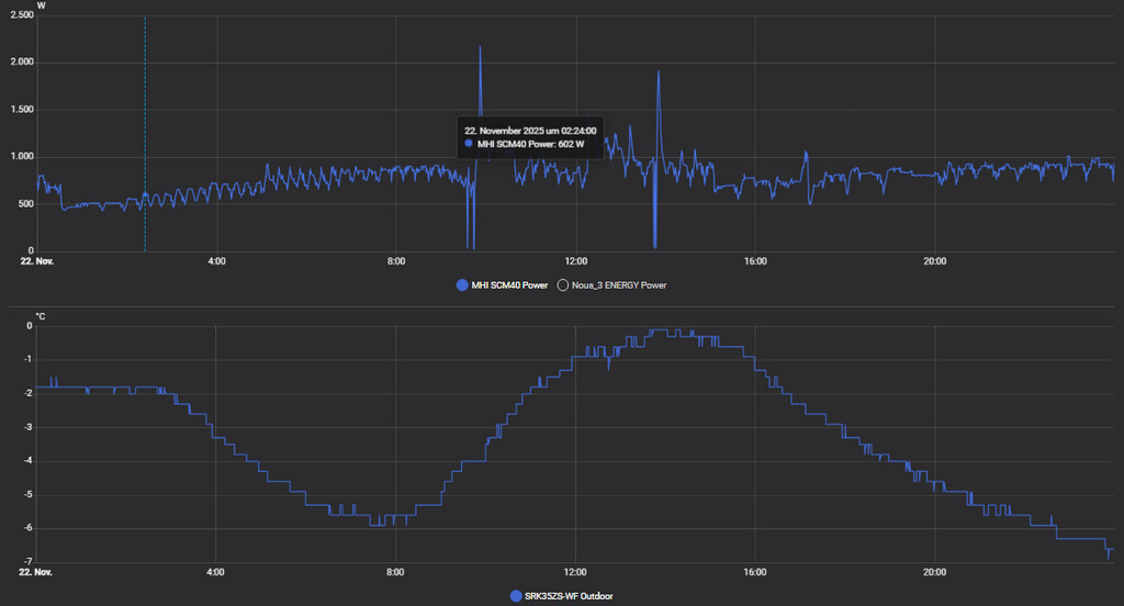 Bei der MHI ist es ja schwer durch das Zweitgerät, aber egal ob es An oder Aus, das SRK35 strebt immer ein Delta 10-14°C an und rechnerisch komme ich auf einen COP von 2,7-3,3, auch wenn das Zweitgerät ausgeschaltet ist.