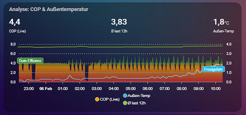 Wie man an der Durchschnittsmessung über 12h sieht fällt dadurch der COP ein wenig ab.