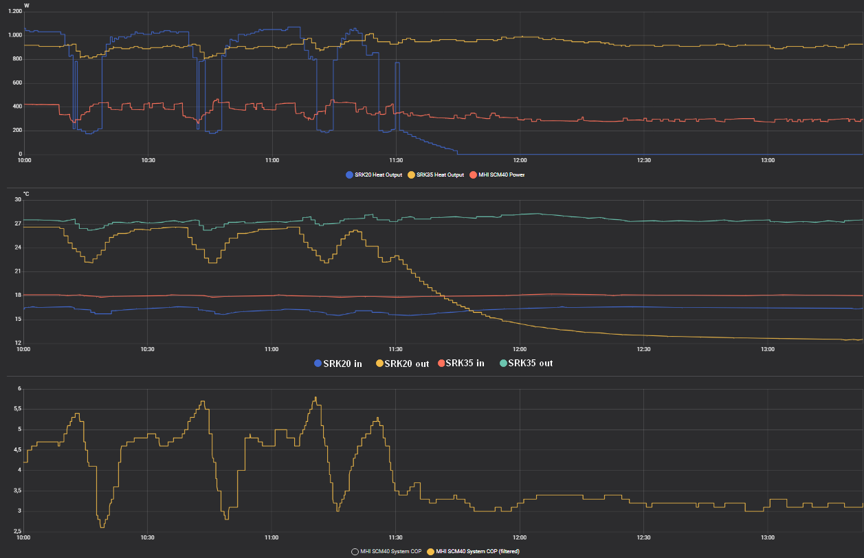 Der COP, welcher vorher durch das taktende SRK20 noch um die 4 pendelte, sinkt rapide ab, auf ca. 3,3 und erholt sich auch nicht wieder. Gut zu sehen, der Stromverbrauch sinkt um ca. 100Watt und Heizleistung sowie Delta des SRK35 laufen recht gleich weiter.