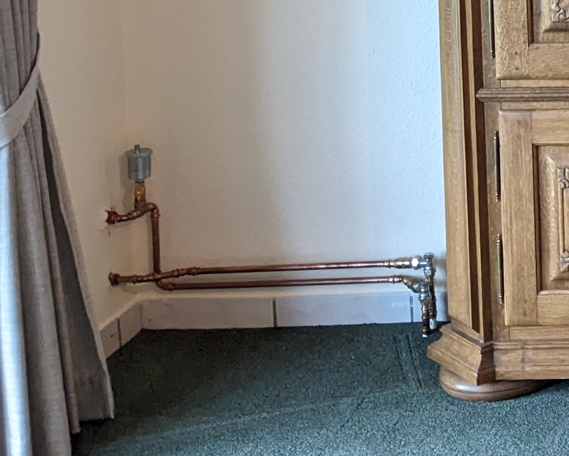 ok, ich vermute unterhalb dieses Heizkörperauslasses, was dann zur Versorgung des Wintergartens umgebaut wurde, befindet sich ein dickeres Rohr im Estrich. Mal schauen ob ich da noch einigermaßen drankomme.