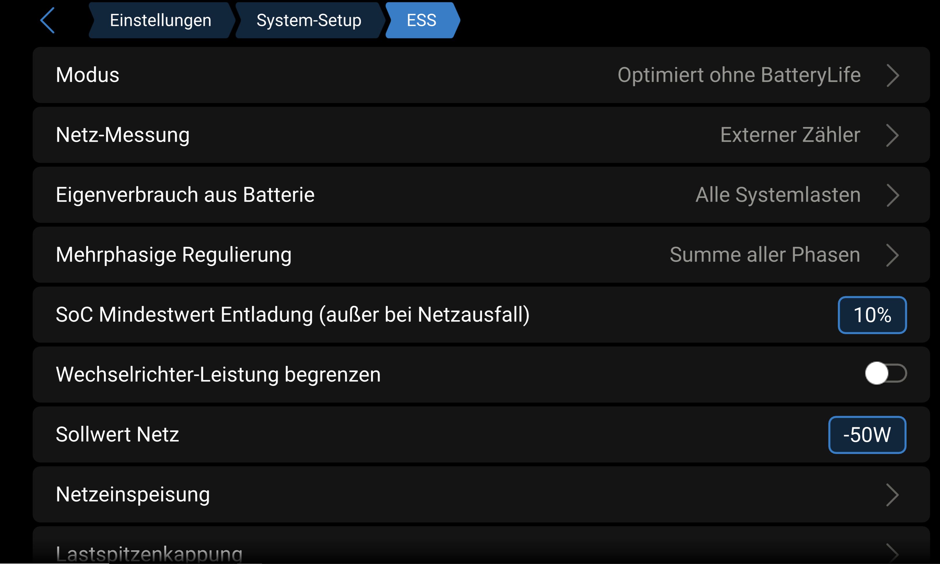Du bist aber auf dem richtigen Weg. Aber man muss sich tief einarbeiten und auch ein Gefühl für Spannungen, SoC usw. bekommen. Ich würde die untere Entladegrenze noch auf min. 20 % anheben. 10 % kann nicht viel mehr als nichts sein. Das JK-Bms misst oft nur Mist, gerade beim SoC. Das Gefühl kommt erst mit der Zeit und Beobachtung.