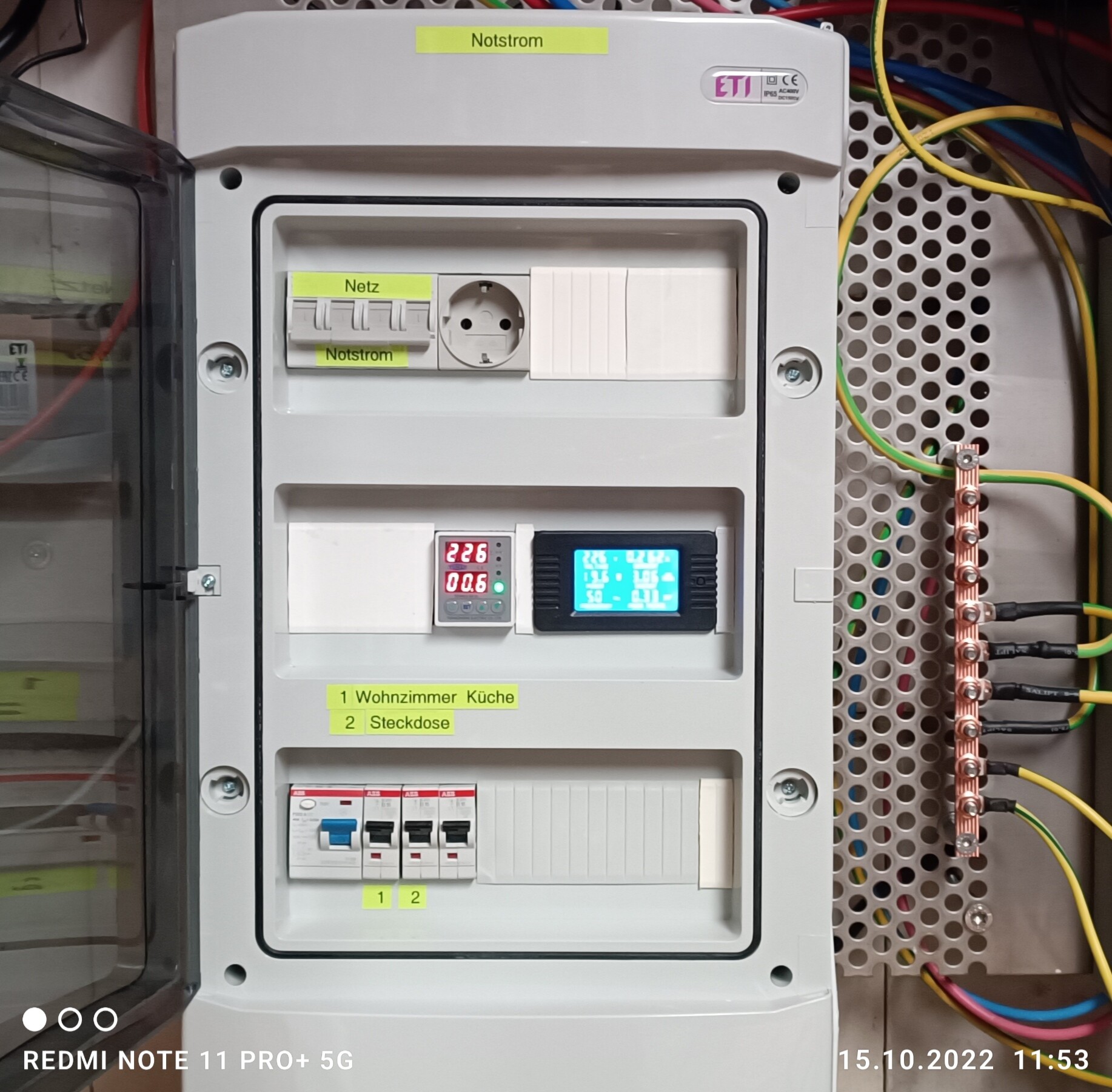 Ich habe das Konzept von Victron anders verstanden und entsprechend umgesetzt. Der Küchen und Wohnzimmerkreis hängt immer auf dem ac-out2, im Falle eines Stromausfalls wird dieser dann entsprechend aus der Batterie/Solar versorgt. Falls der MPII einen Defekt hat, schalte ich auf den vorhandenen Kreis im Haussicherungkasten um und kann ihn ausbauen und einschicken. Zusätzlich habe ich eine Steckdose um den zweiten Kühlschrank per Kabeltrommel versorgen zu können. Das Bild zeigt die Unterverteilung die das umsetzt, oben links ist ein vierpoliger Um/Wahlschalter, dieser Schaltet mit Neutralstellung L, N und PE.
