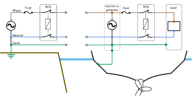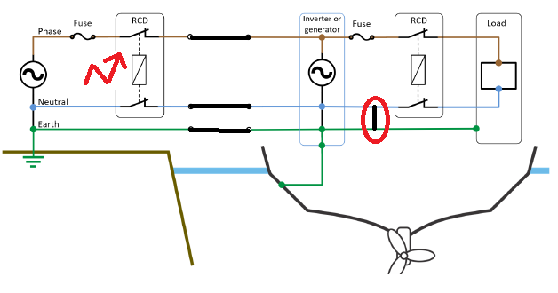 Der dort gezeigte RCD auf der Landstromseite würde auslösen, wenn man auf Seite des Bootes N und PE fest verbindet. Da sind die Relais im Multiplus zwingend erforderlich.