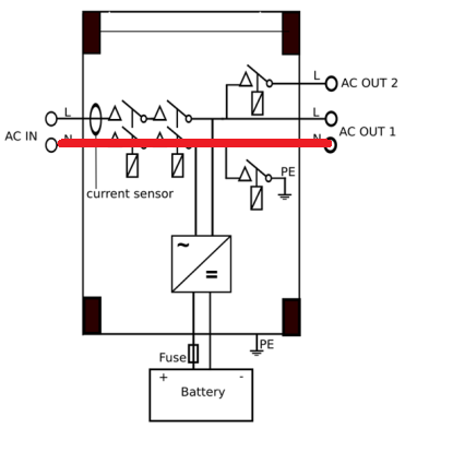 Der interne Aufbau des Multiplus ist mir unbekannt; also ob zwischen dem Punkt, an dem das Relais die Brücke zwischen N und PE herstellt und dem N an den Klemmen von ACout noch weitere Beschaltung ist, sei es eine Strommessung o.a.