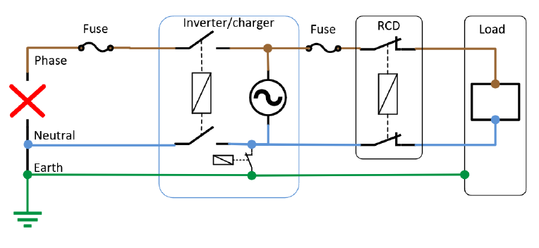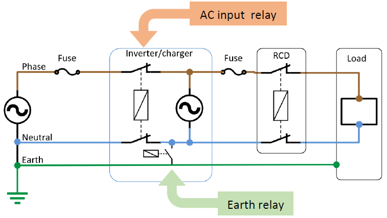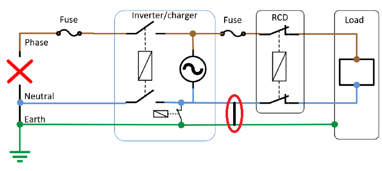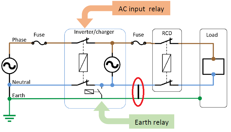 Längere Erklärung: Bekanntlich verfügt der Multiplus über Relais, die beim Umschalten von OnGrid / Pass Throught auf Inverter / OffGrid die Phase und N vom Netz trennen sowie PE und N verbinden.