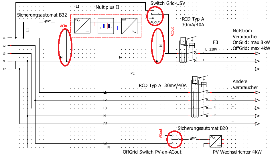 Meine gesamte Anlage (alle Gehäuse von WR, MPPT ect.) hängt auf der Potentialausgleichschiene vom Haus. Aus dem Sicherungskasten gehen zwei Kabel (je 3x2,5) zur Unterverteilung zum Umschalter, damit kann ich den Kreis Küche/WZ auf den "originalen" LS/FI schalten oder auf den ac-out2 vom MPII 5k. Der Kreis wird immer über den Multiplus versorgt. Das funktioniert sehr gut, allerdings ist historisch gewachsen der Backofen separat und die Spülmaschine auch um die Kabel zu schonen. Diese würden dann nicht mehr funktionieren wenn der Saft von außen weg wäre. Unten ist die geforderte LS/FI Absicherung ausgeführt die an dem ac-out2 geklemmt sind. Von wo der Batteriewechselrichter sein PE bekommt weiß ich nicht, ich habe das mit einem Duspol getestet und der RCD löst bei 30mA aus. Das hat mir so gereicht.