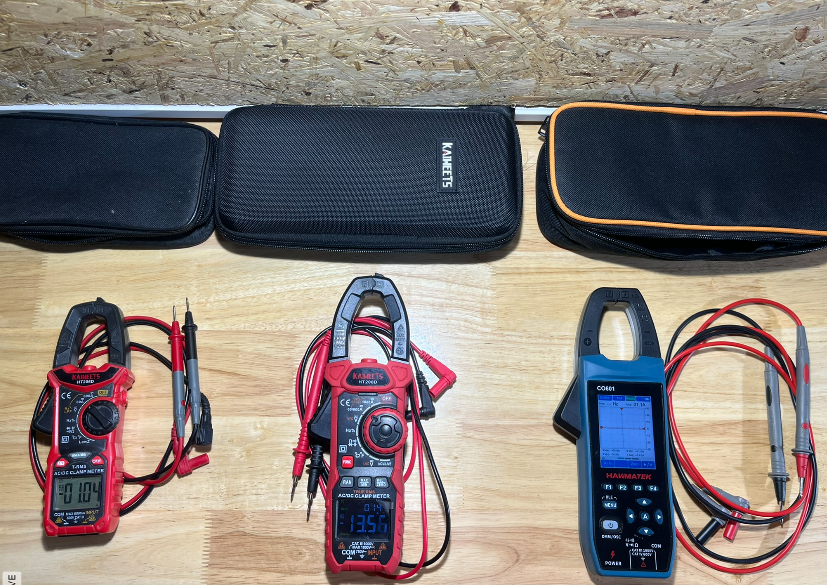 Darunter Stromzangen, eine davon kürzlich gekauft mit Speicherfunktion (Oszi):