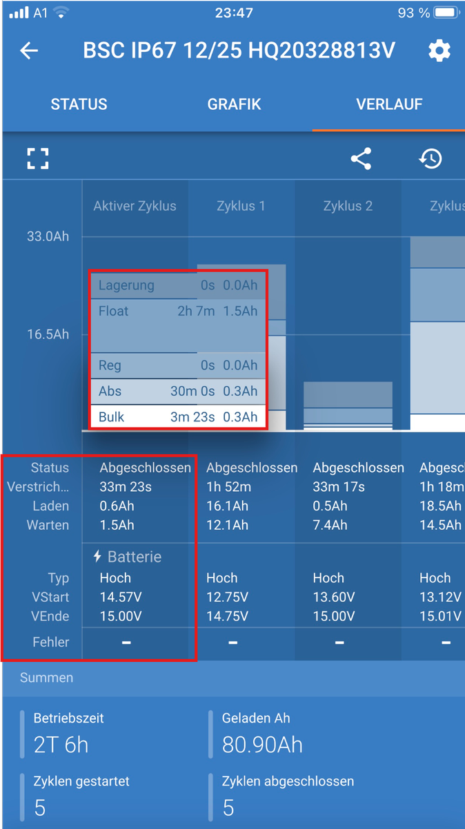 Also, nun war interessant was passiert, wenn ich eine längere Strecke am Stück mit dem Auto fahre und dann das Ladegerät in AGM Modus nachladen lasse.