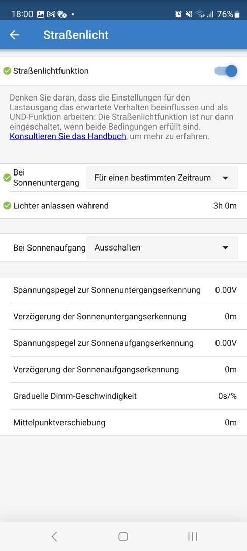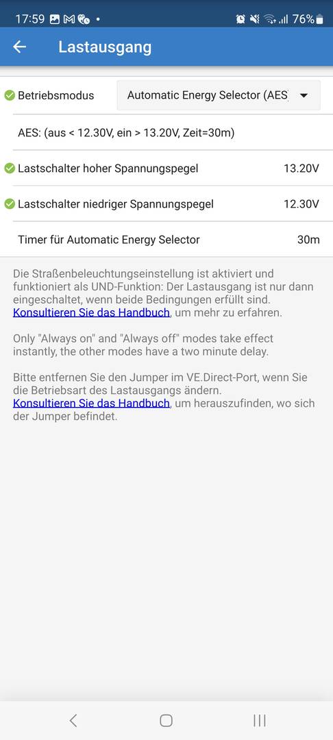Die Straßenlicht-Funktion des Mppt. Mit einem Victron Shunt (habe ich noch liegen) könnte ich bei Unterschreitung von ...V abschalten.