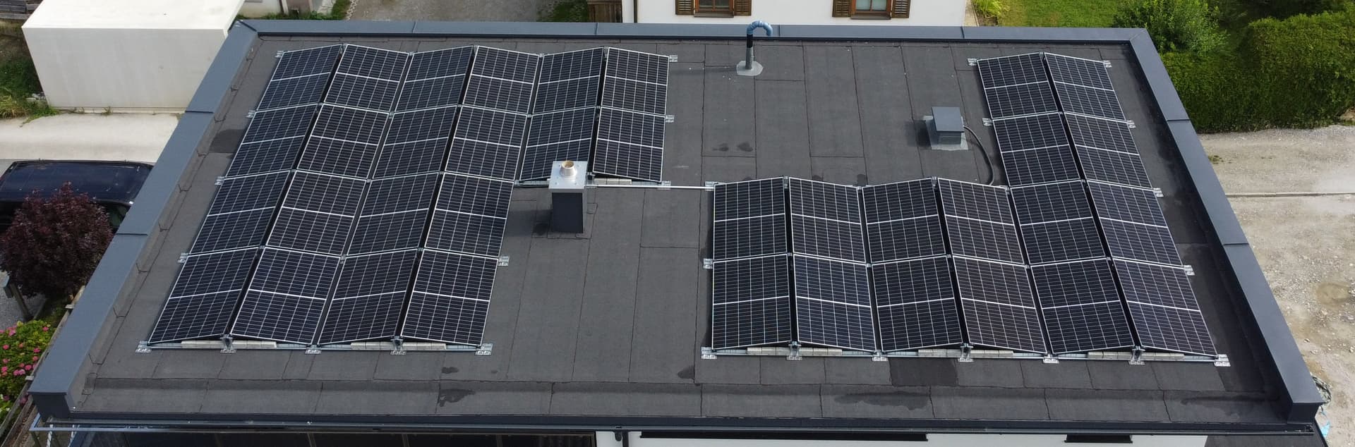 Auf unserem Flachdach mit Gefälledämmung haben wir 16,7kWp Trina Solar 450 Wp Module in Ost/Westausrichtung montiert.