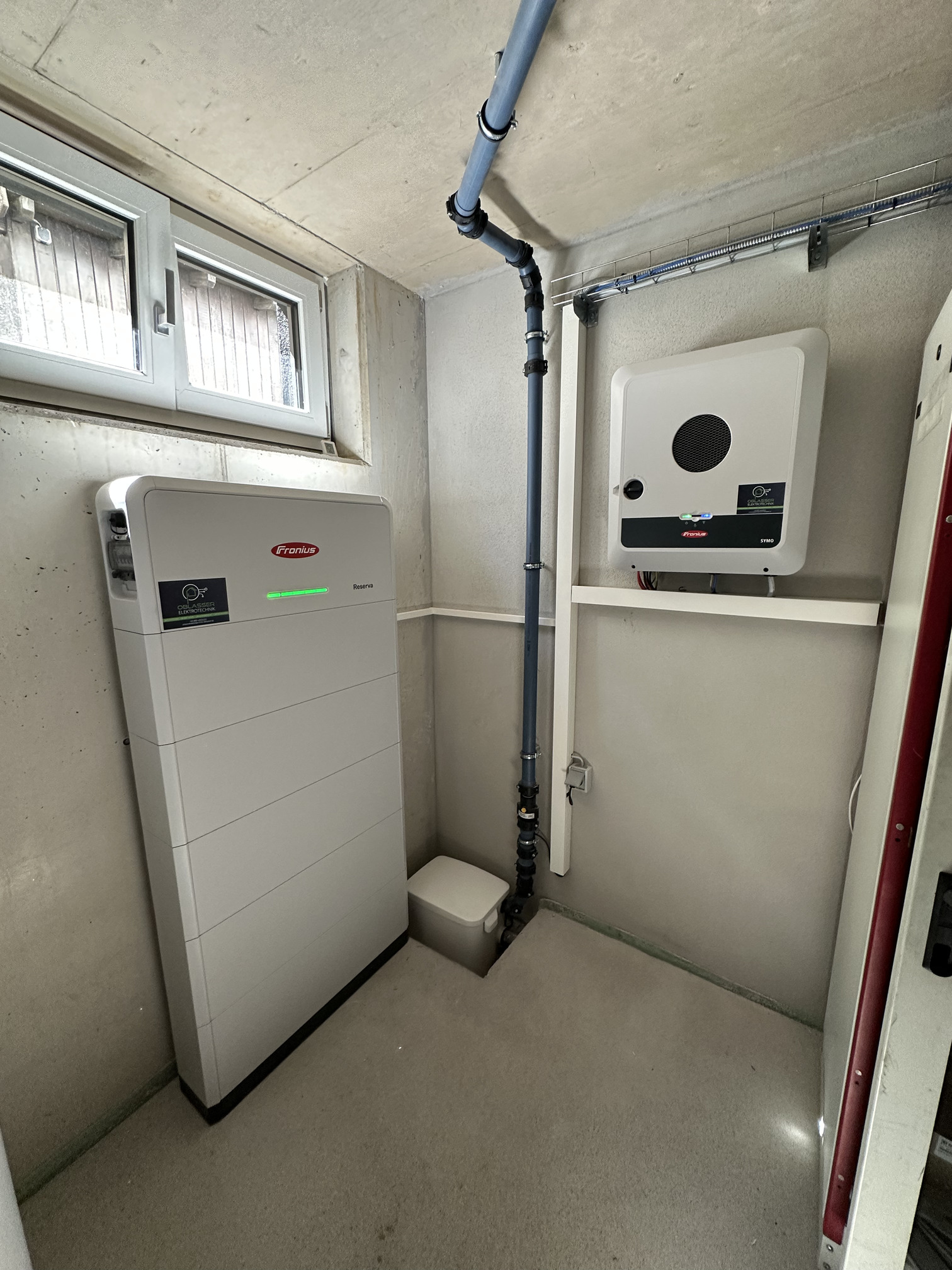 Wechselrichter ist ein Fronius Symo Gen24 12.0 SC Plus, als Speicher haben wir einen Fronius Reserva 15.8 genommen.