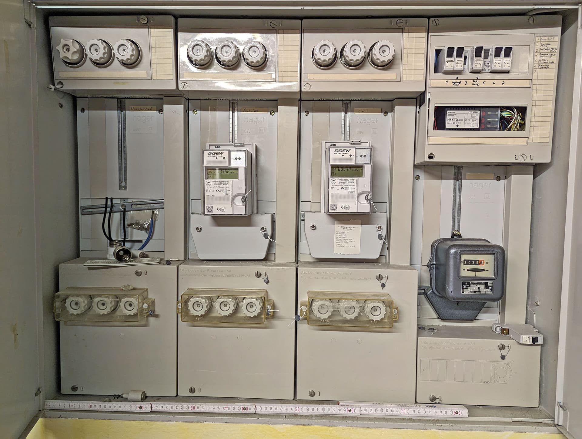 Für mich (als Laie) auf dem Bild schlecht zu sehen, ob die Leitungen hinter dem blauen Neutralleiterblock nach oben verschwinden oder erstmal nach hinten in die Wand gehen und dann hoch. Verpixle vielleicht noch die Zählernummern, da können "Witzbolde" wohl irgendwelchen Mist mit machen. Kannst Du bei dem Aufbau des Zählerschranks denn die aktuellen Anforderungen des NB erfüllen? Ich hatte in der neuen Wohnung der Schwiegereltern von meinem Elektriker auch den Job bekommen, die Leitungen in die Wohnung vorsichtig freizuklopfen. Ging eigentlich ganz gut (Kalksandstein).