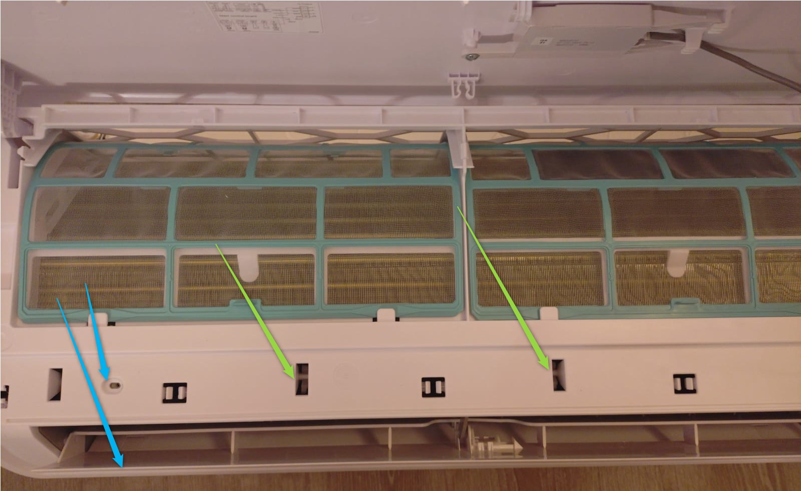 Bei meinem IG (12.000BTU) ist noch unten in der Mitte eine Schraube unter einer Kunststoff Abdeckung. Also unten im Luftauslass hinter der Lamelle. Rastnasen sind nur oben welche.