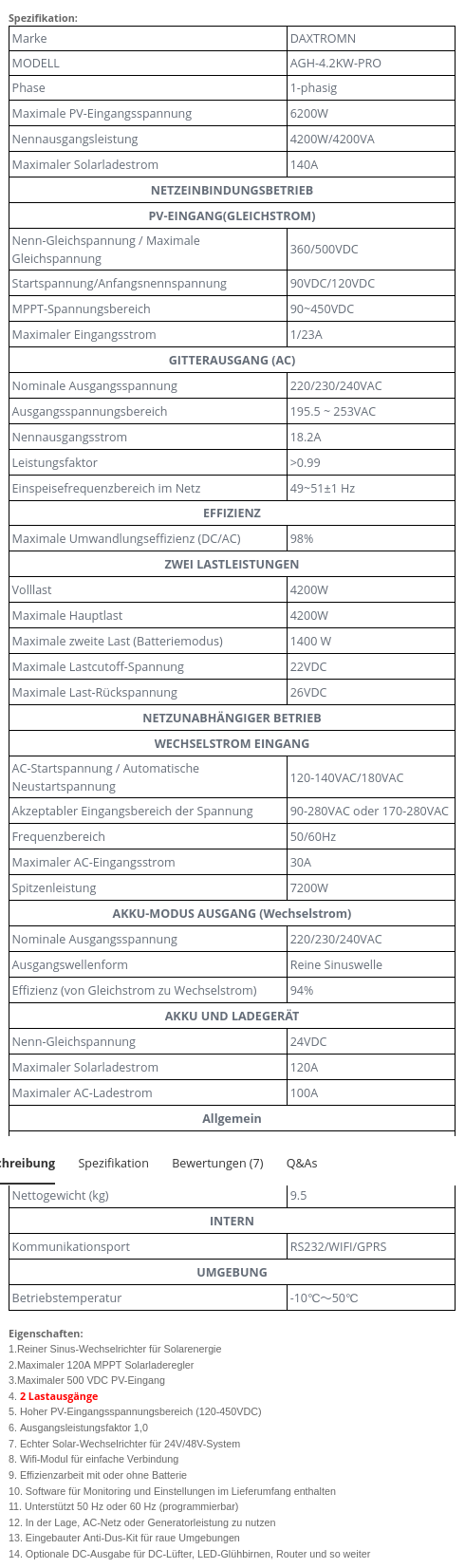 Ich habe mal nach passenden Hybrid-Invertern geschaut. Der nachfogende ist NICHT geeignet für deine Module, da er seinen MPP-Tracker erst bei 90V aktiv werden lässt. Ich habe ihn hier jetzt nur herausgesucht, um über die Daten und die Preise sprechen zu können. Die brauchbaren Wandler zwischen 3.500 und 6.500 Watt Sinus-Leistung bekommt man schon ab 230€. Die Batteriezellen weren bis nach Hause schon für 45€ pro Kilowattstunde geliefert. Am besten passen zu den Wandlern im Moment diejenigen Zellen mit 320Ah. Da benötigt man zusätzlich zum eingebauten Laderegler selten noch zusätzliche BMS; aber Balancer sind ratsam.