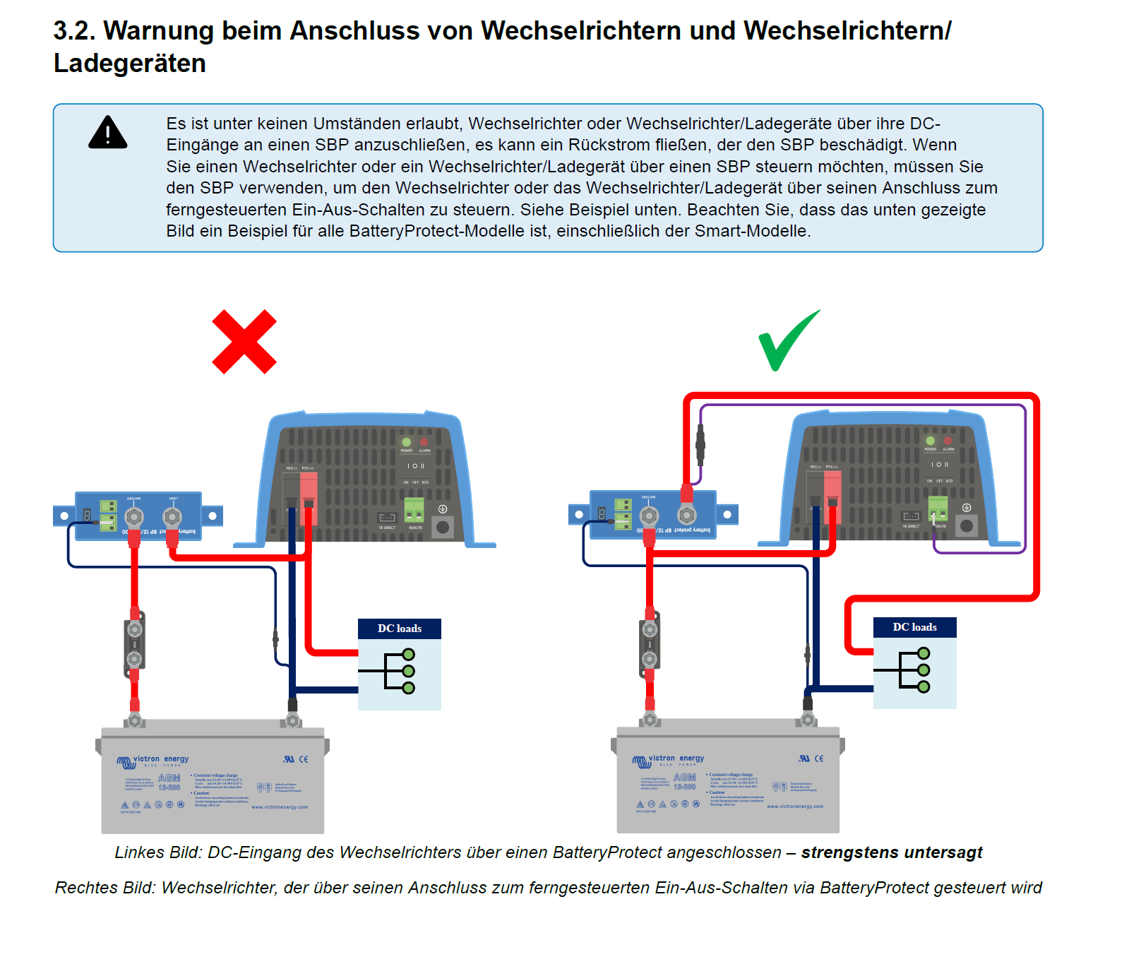 den BatteryProtect solltest du nicht einsetzten. In der Bedienungsanleitung ist zu lesen, dass er keine WR als Last mag. Das hat was mit den Einschaltspitzen zu tun. Die kann das Gerät nicht vertragen und wird i.d.R. leitend, kann also nicht mehr abschalten.