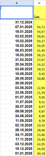 Die Tabelle unten zeigt in der Spalte Gas den Tagesdurchschnitt kWh pro Tag im Vergleich zur letzten Ablesung.