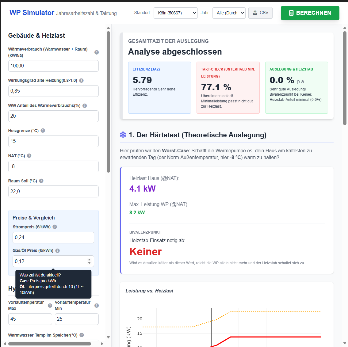 Ich habe einfach mal aktuelle Werte basierend auf unserer Gasheizung eingetragen und die vordefinierten Wärmepumpenwerte dagegen geprüft. Alle gelisteten Wärmepumpen wären nach dem Tool Überdimensioniert