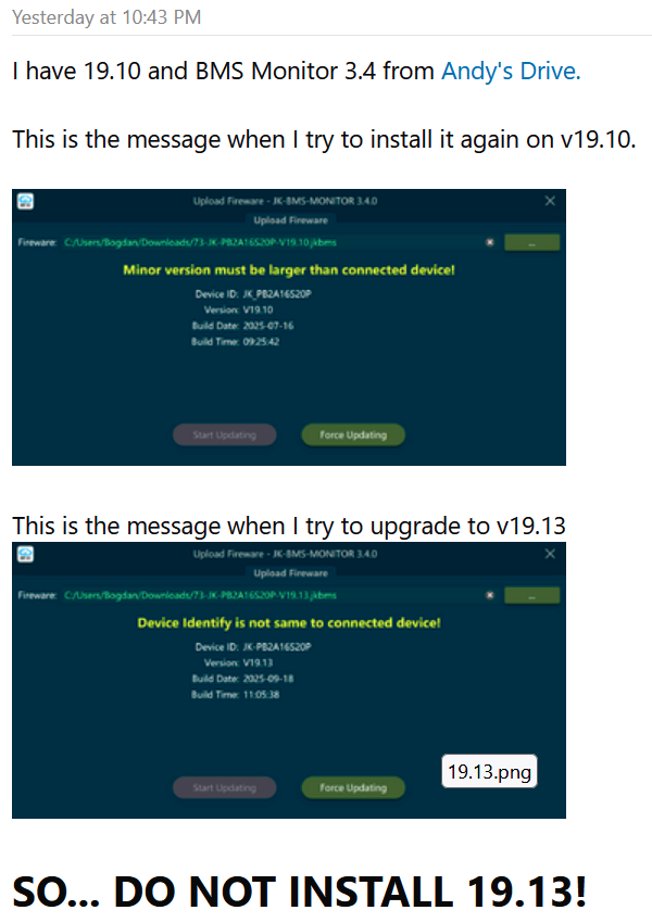 Amy Wan hat ihre Kontakte zu JK genutzt und nach Abfrage der BMS Seriennummern die Rückmeldung bekommen, dass ein Firmware Update auf 19.13 erforderlich ist. Dateien wurden direkt mitgeschickt.