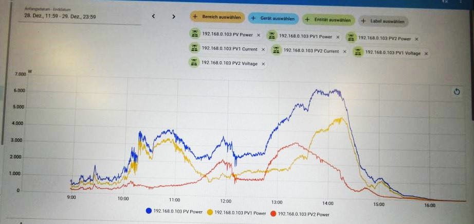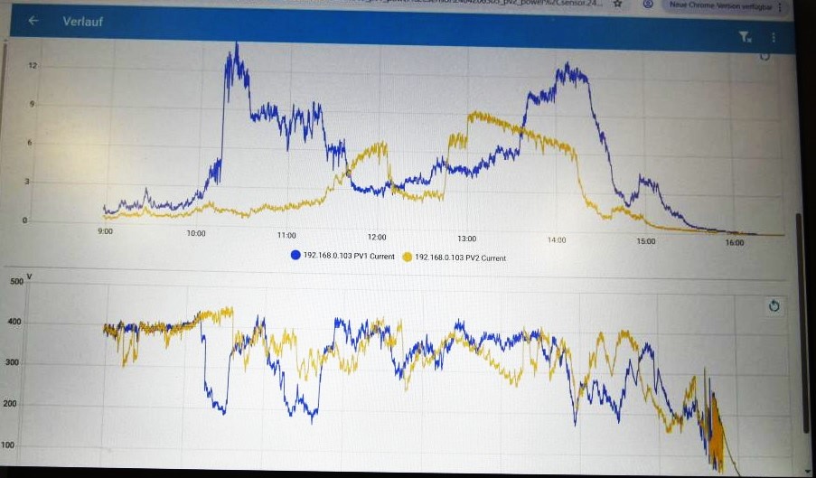 Eine Reihe in der Länge des Daches: 12Stk. + 6 Stück darunter, und eine Reihe mit 12Stk. + 6 Stück darüber. Ich nehm mal an da sind immer 9 zusammen in Reihe. Das deckt sich mit den ca. 360-410V . Da zieht im Winter wegen niedrigem Sonnenstand der Baumschatten der Nachbarsbäume drüber.